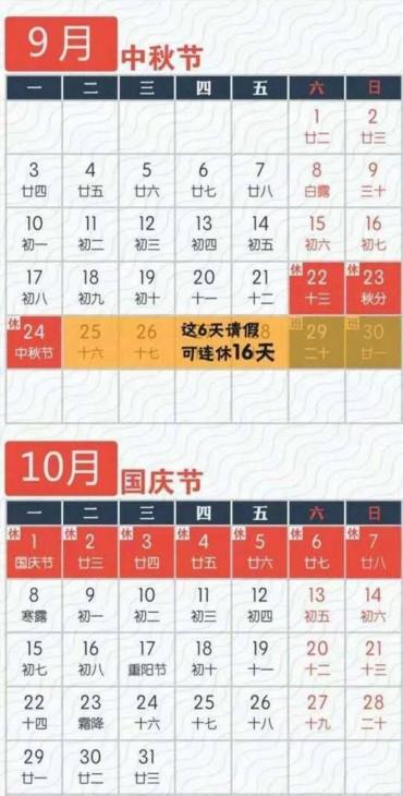 攻略一,国庆、中秋两个假期之间请年休假6天,拼出“中秋+国庆史上最长假期”16天;攻略二,国庆节后连休5天年假,拼出14天长假。