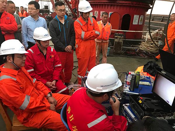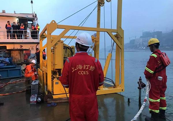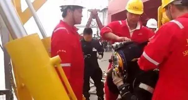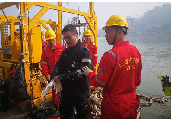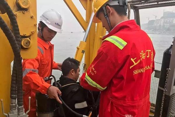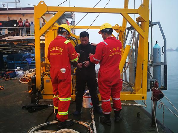 6时50分,设备调试完成后,交通运输部上海打捞局两名专业潜水员第一次下水摸探。