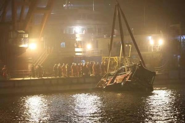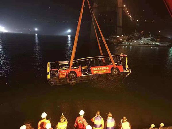21时31分,开始对重庆万州坠江公交车进行起吊工作。23时45分,成功将坠江公交车整体打捞出水。