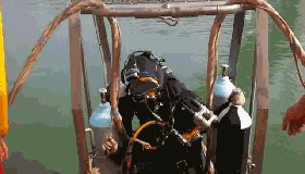 17时38分,第九组潜水员下水,检查车辆离底状态,为起吊做最后准备。