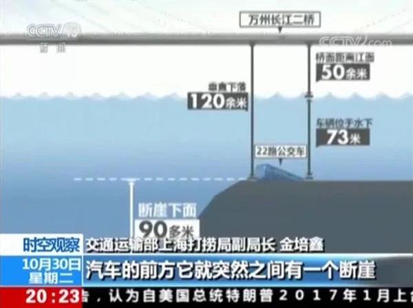 31日21时31分,交通运输部上海打捞局专业潜水员完成对重庆坠江公交车吊带的安装工作后,公交车的起吊工作正式开始。23时45分,公交车整体打捞出水。