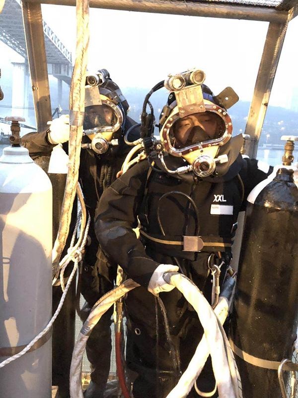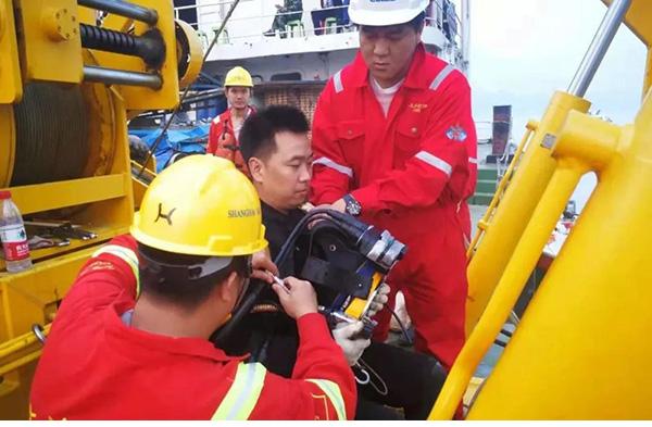 超过60米水深,就需要使用专业氦氧潜水技术。在潜水前需要根据实际水深配置潜水员呼吸用的氦气和氧气,再由专业潜水员开展水下工作。在氦氧混合气体潜水作业条件下,为保障潜水员的安全,每次作业时间最长只有35分钟左右。作业完毕后,潜水员需要在上浮过程中逐步减压两个半小时,出水后还要再进入减压舱减压3小时。