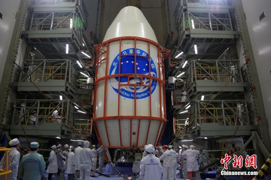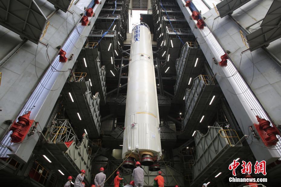 11月1日深夜23时57分,中国在西昌卫星发射中心用长征三号乙运载火箭,成功发射第41颗北斗导航卫星。这颗卫星属于地球静止轨道卫星,是中国北斗三号系统第17颗全球组网卫星,也是北斗三号系统首颗地球静止轨道卫星。图为卫星发射前,火箭在发射场进行吊装(资料图片)。中新社发 史啸 摄