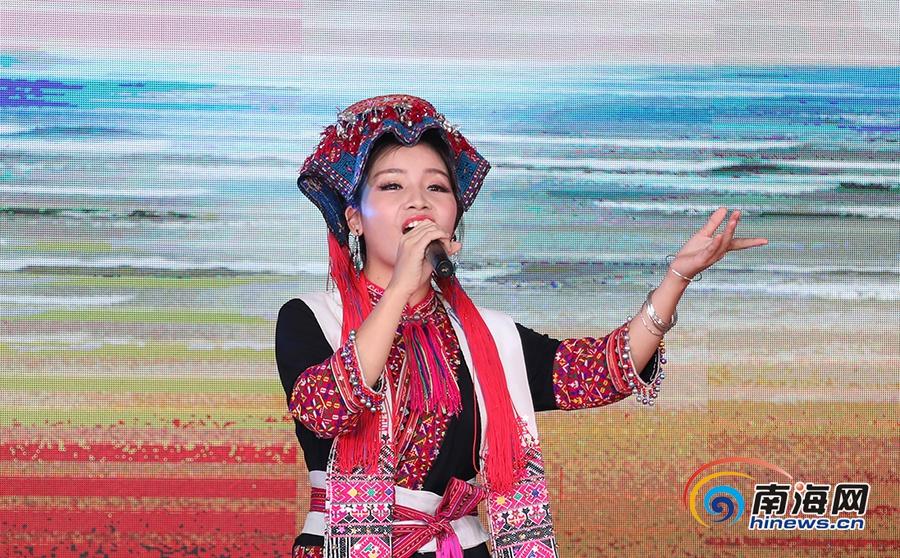 五指山苗族歌手曾若馨身着苗族传统服饰,倾情演唱了歌曲《春雨来到咱苗村》。南海网记者李昊摄