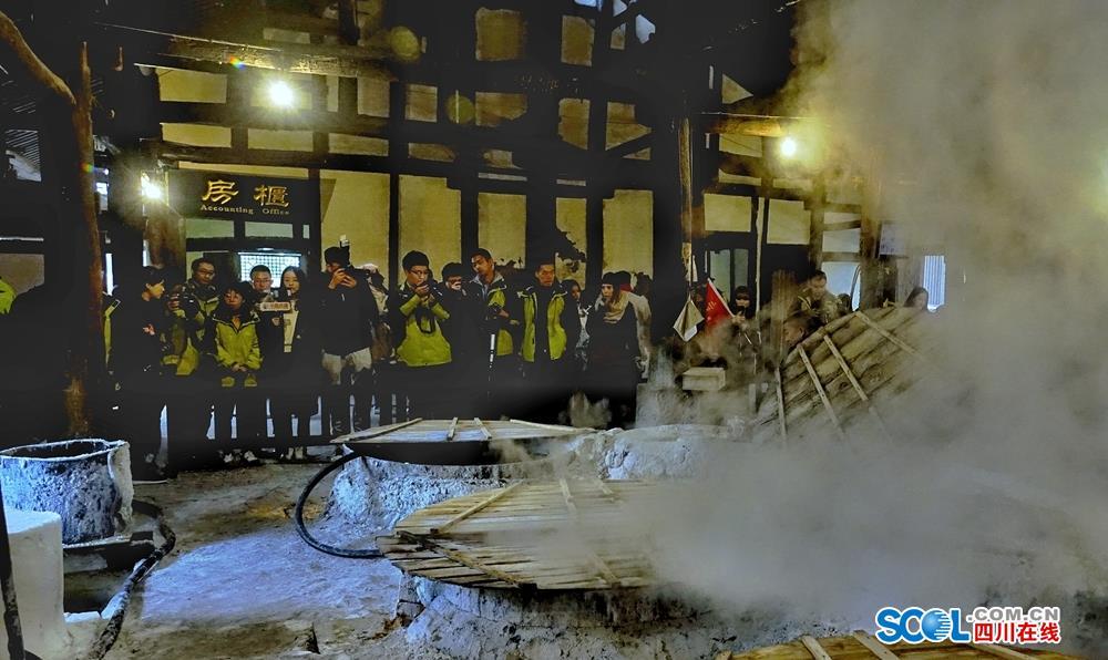 “千年盐都”得源于自贡悠久的井盐生产历史,早在2000年以前,这里就以打井的方式抽取地下卤水,通过汲卤、输卤到用铁锅进行煎盐,从而制作成成品盐。燊海井坐落于自贡大安区阮家坝山下,开凿于清代道光十五年(公元1835年),是当时世界上第一口超千米(1001.42米)深盐井,至今仍保留着用大铁锅土法熬制井盐的千年传统手工制盐技艺。据介绍,燊海井现有八口圆锅煎盐,每日产量仍保持在两吨左右。