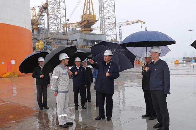2018年6月13日,习近平冒雨来到中集来福士海洋工程有限公司烟台基地,视察海洋工程设备建设场地。新华社记者 谢环驰 摄