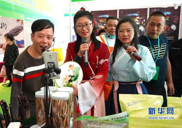 11月6日,参展商在森林食品展区直播销售鹿角灵芝。5wb安康新闻网