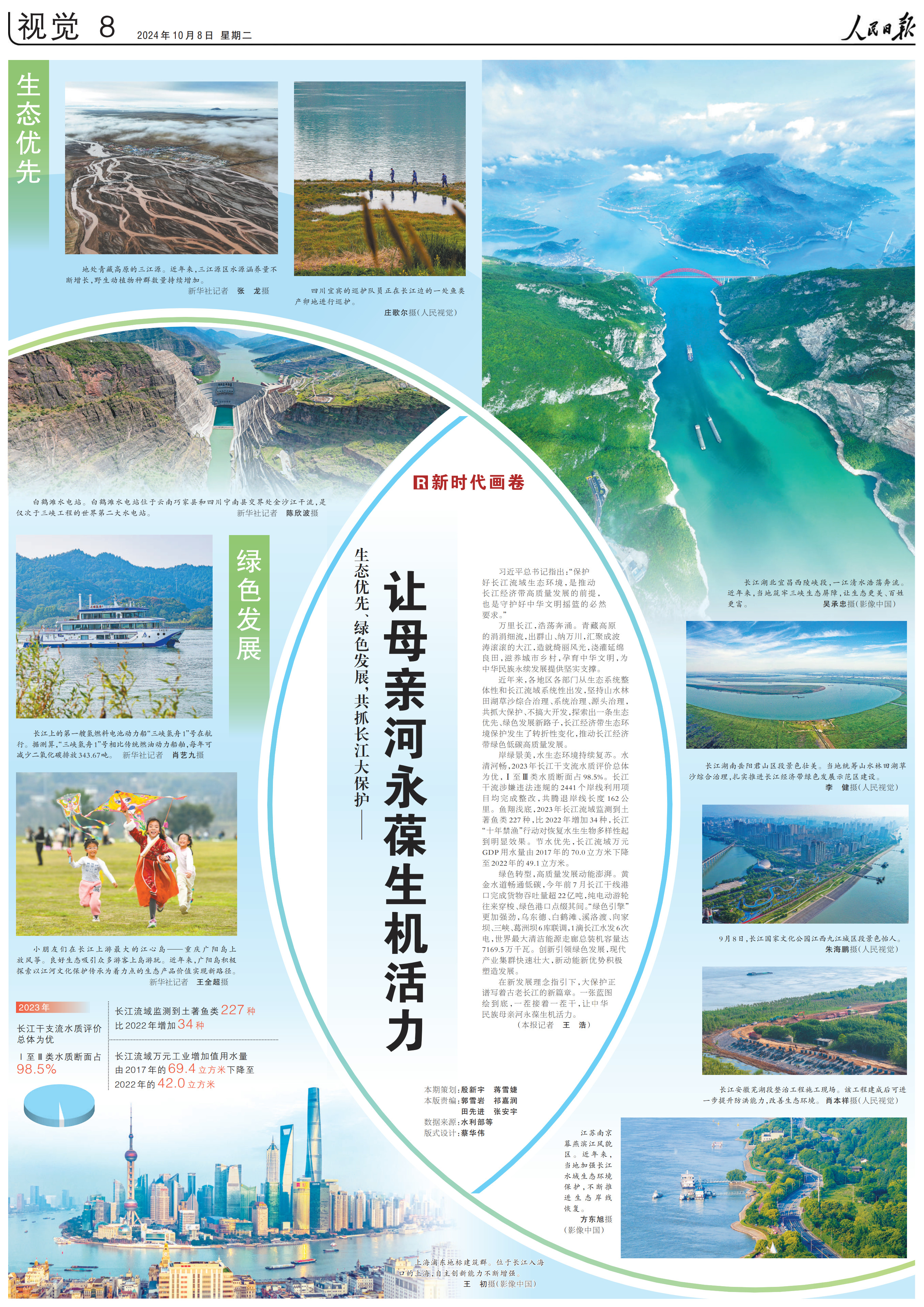 岸绿景美,水生态环境持续复苏。水清河畅,2023年长江干支流水质评价总体为优,Ⅰ至Ⅲ类水质断面占98.5%。长江干流涉嫌违法违规的2441个岸线利用项目均完成整改,共腾退岸线长度162公里。鱼翔浅底,2023年长江流域监测到土著鱼类227种,比2022年增加34种,长江“十年禁渔”行动对恢复水生生物多样性起到明显效果。节水优先,长江流域万元GDP用水量由2017年的70.0立方米下降至2022年的49.1立方米。hk7安康新闻网
