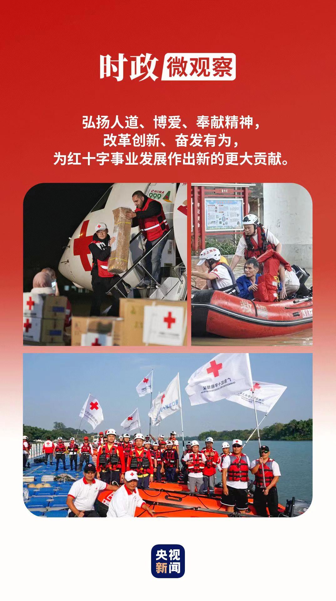 “新时代新征程,中国红十字会要坚持党的全面领导,聚焦高质量发展,进一步深化改革创新,增强政治性、先进性、群众性,加强公信力建设,提高人道服务能力,积极参与和支持国际人道主义事业,为以中国式现代化全面推进强国建设、民族复兴伟业和促进人类和平与进步事业作出新的更大贡献。”