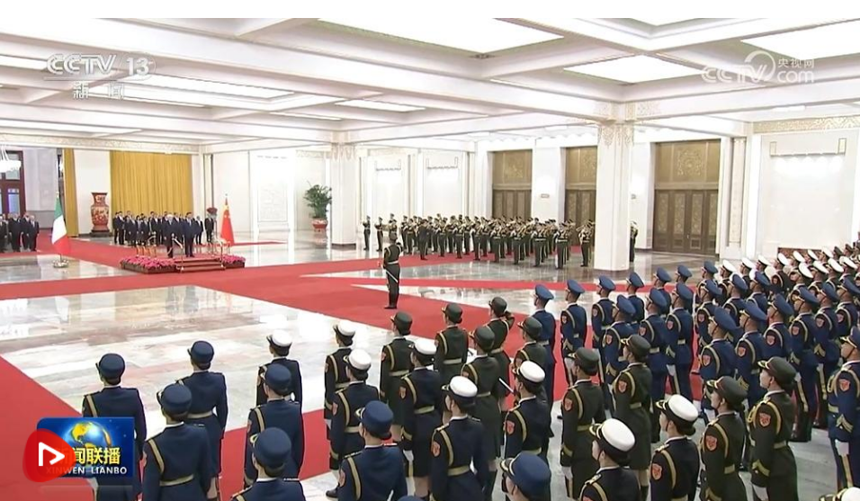 天安门广场鸣放21响礼炮,礼兵列队致敬。两国元首登上检阅台,军乐团奏中意两国国歌。马塔雷拉在习近平陪同下检阅中国人民解放军仪仗队,并观看分列式。