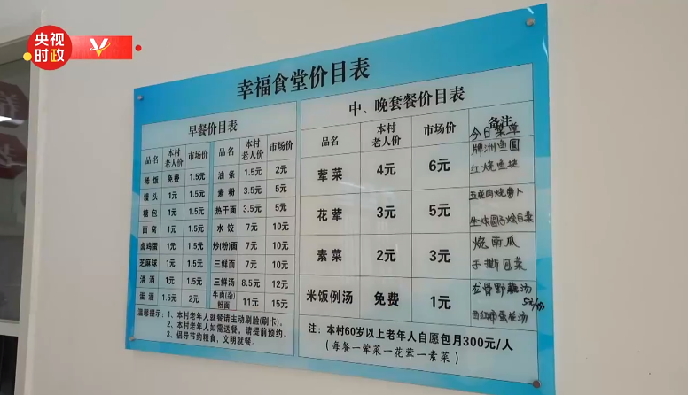 随行记者用镜头记录了这样一幕:站在养老服务驿站幸福食堂价目表前,总书记仔细察看当天菜单。菜单中既有种类丰富的早餐,也有六菜两汤的中、晚套餐,荤素搭配、营养均衡;村中老人用餐还有特别优惠,另外还有免费的稀饭和米饭例汤……