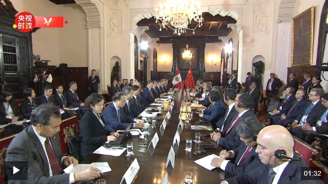 当地时间11月14日下午,国家主席习近平在利马总统府同秘鲁总统博鲁阿尔特举行会谈。