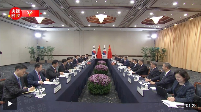 习近平指出,这是2022年巴厘岛之后我们时隔两年再次会晤。过去两年,国际和地区形势发生不少变化。无论形势如何变化,中韩都应该坚守建交初心,坚定睦邻友好方向,坚持互利共赢目标,发挥地理相邻、文化相通、经济相融优势,加强交流,深化合作,推动中韩战略合作伙伴关系健康稳定发展,更好造福两国人民,为促进地区和平稳定和发展繁荣作出更大贡献。