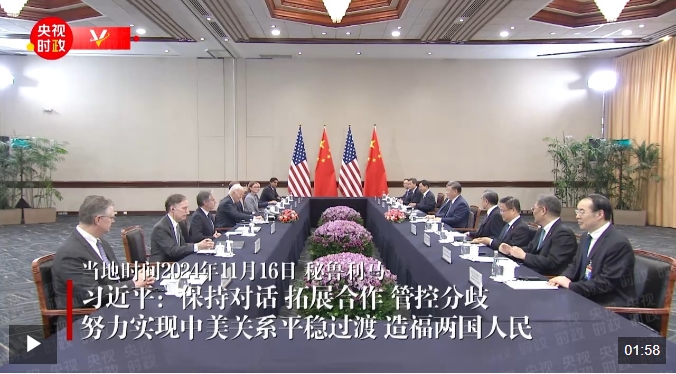 习近平指出,很高兴再次同拜登总统先生见面。过去4年,中美关系虽然历经跌宕起伏,但在我们两人领航把舵下,也开展了卓有成效的对话和合作,总体实现了稳定。美国刚刚举行了大选。中方致力于中美关系稳定、健康、可持续发展的目标没有变,按照相互尊重、和平共处、合作共赢处理中美关系的原则没有变,坚定维护自身主权、安全、发展利益的立场没有变,赓续中美人民传统友谊的愿望没有变。中方愿同美国政府继续保持对话、拓展合作、管控分歧,努力实现中美关系平稳过渡,造福两国人民。