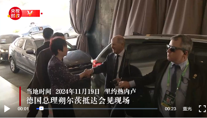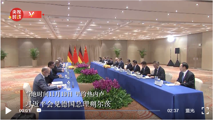 当地时间11月19日,国家主席习近平在里约热内卢出席二十国集团领导人峰会期间会见德国总理朔尔茨。