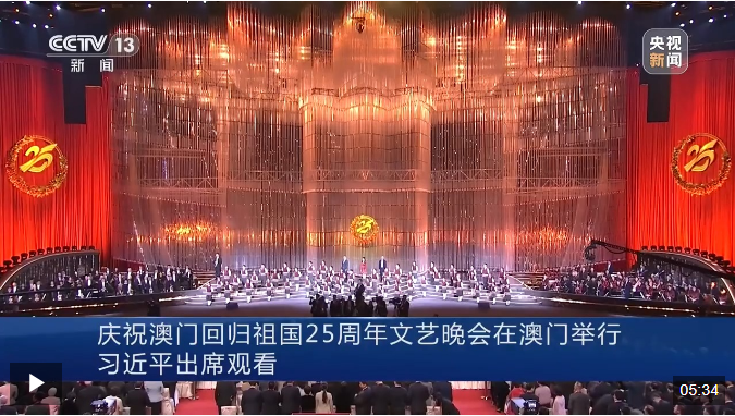 镜海扬帆风正劲,濠江欢歌向未来。庆祝澳门回归祖国25周年文艺晚会19日晚在澳门东亚运动会体育馆举行。中共中央总书记、国家主席、中央军委主席习近平观看了演出。