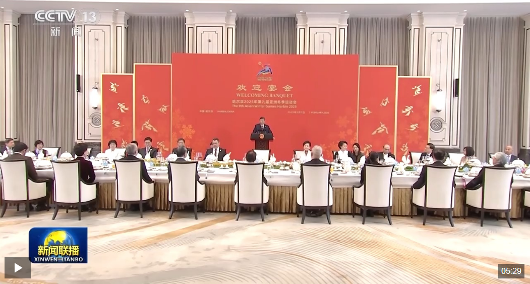 2月7日中午,国家主席习近平和夫人彭丽媛在黑龙江省哈尔滨市太阳岛宾馆举行宴会,欢迎来华出席哈尔滨第九届亚洲冬季运动会开幕式的国际贵宾。
