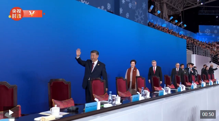 19时58分,在《和平——命运共同体》的乐曲声中,习近平和夫人彭丽媛,同国际奥委会主席巴赫、亚奥理事会第一副主席霍震霆等步入主席台,向观众挥手致意。全场响起长时间的热烈掌声。