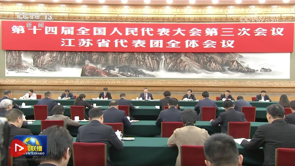 在听取大家发言后,习近平作了发言。他首先表示赞成政府工作报告,对江苏工作予以肯定,希望江苏落实好挑大梁的责任,努力取得新的更大成绩。