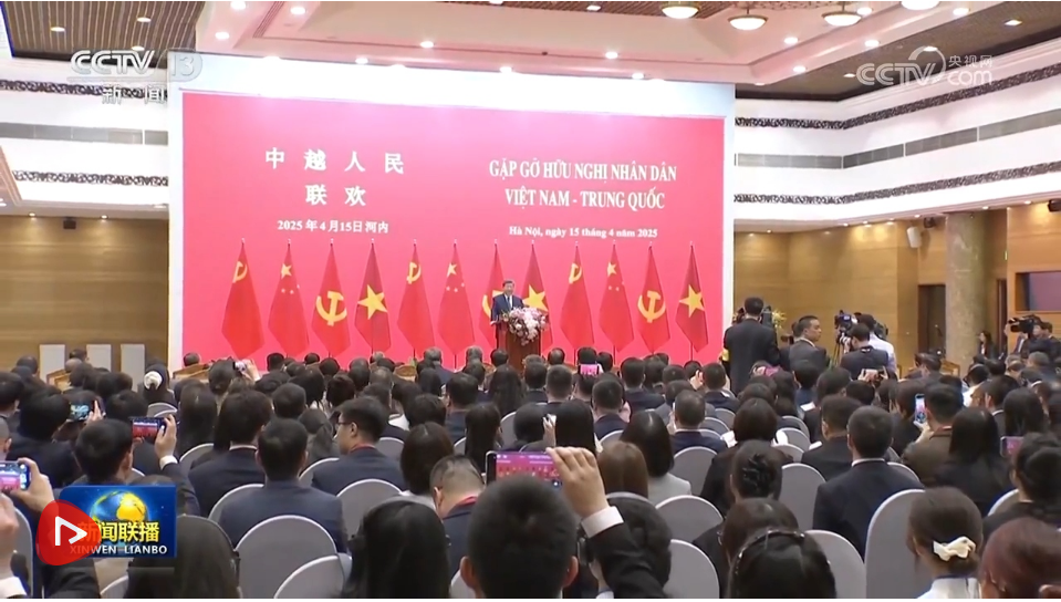 4月15日上午,中共中央总书记、国家主席习近平在河内国际会议中心同越共中央总书记苏林、越南国家主席梁强共同会见中越人民大联欢活动代表。