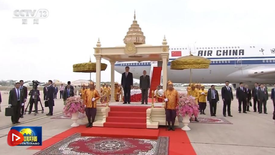习近平乘专机抵达金边国际机场时,西哈莫尼国王率夏卡朋亲王、阿伦公主等王室成员,人民党主席、参议院主席洪森,国会第一副主席钱业以及郭索帕、布拉索昆、韩春那洛、韶索卡、洪玛尼等五位副首相在机场热情迎接。礼兵分列红毯两侧。柬埔寨王室珍娜公主向习近平献上茉莉花手环,女青年沿途向红地毯抛撒花瓣。