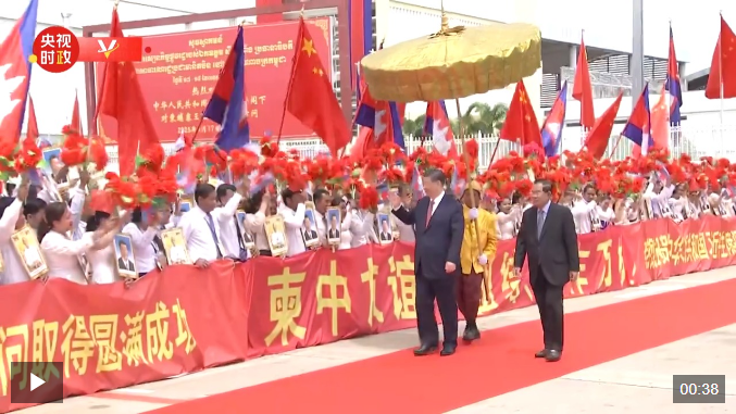 洪森在机场为习近平主席举行隆重欢送仪式。习近平在洪森陪同下检阅仪仗队。习近平向欢送人群挥手致意。