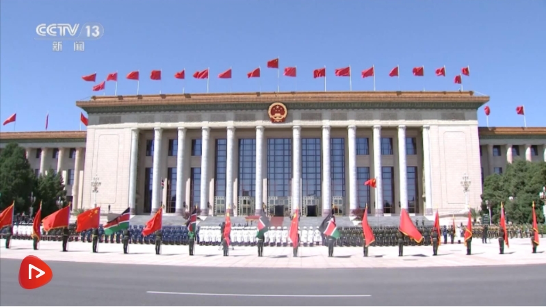 4月24日上午,国家主席习近平在北京人民大会堂同来华进行国事访问的肯尼亚总统鲁托举行会谈。这是会谈前,习近平在人民大会堂东门外广场为鲁托举行欢迎仪式。