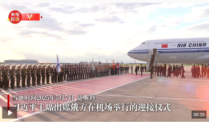 当地时间5月7日晚,国家主席习近平乘专机抵达莫斯科,应俄罗斯总统普京邀请,对俄罗斯进行国事访问并出席纪念苏联伟大卫国战争胜利80周年庆典。