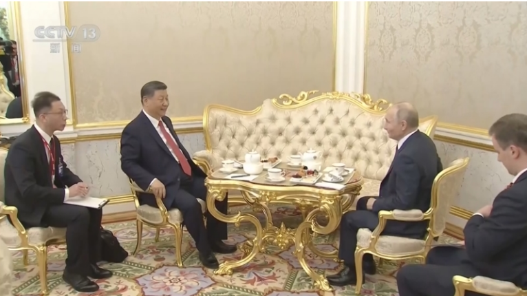 当地时间5月8日下午,俄罗斯总统普京同中国国家主席习近平在克里姆林宫总统办公室进行茶叙。