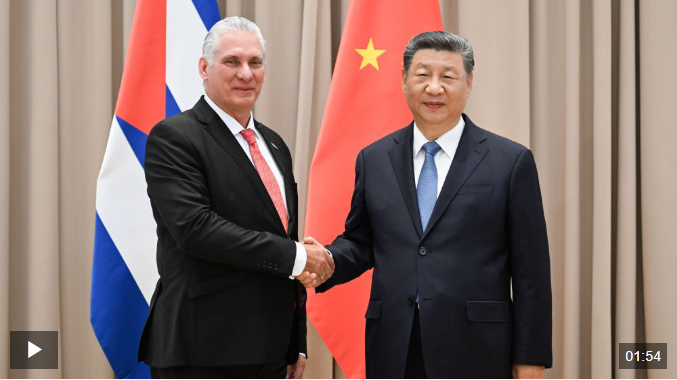 习近平指出,近年来,我同主席同志多次会晤,共同引领中古关系进入政治互信更深厚、战略协作更紧密、民意基础更牢固的新阶段。今年是中古建交65周年,中方愿同古方进一步巩固铁杆情谊,构建更加紧密的中古命运共同体,树立社会主义国家团结合作、发展中国家真诚互助的典范。双方要促进各层级交往、各领域合作进一步走深走实,让高水平政治互信始终成为中古两党两国关系的鲜明标识。中方坚定支持古巴捍卫国家主权、反对外来干涉和封锁,支持古巴经济社会发展。作为全球南方重要成员,双方要在金砖、中拉论坛等框架内加强协调和配合,反对强权政治和单边霸凌,维护国际公平正义。