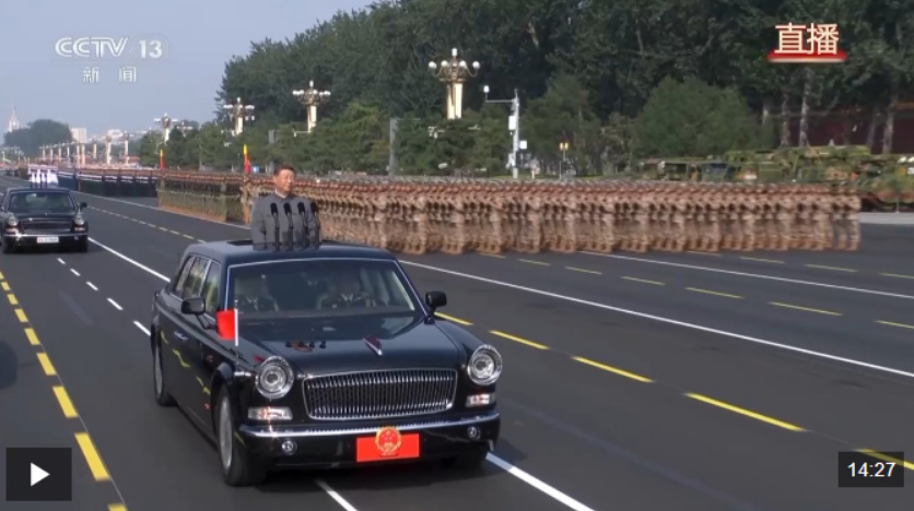 在雄壮的军乐声中,习近平乘车沿着宽阔的长安街,依次检阅徒步方队和装备方队。