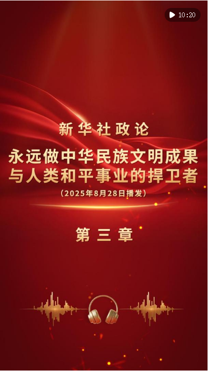 新华社8月28日播发《新华社政论|永远做中华民族文明成果与人类和平事业的捍卫者——写在中国人民抗日战争暨世界反法西斯战争胜利80周年之际》。我们邀请诵读嘉宾吴樾演播“第三章”。bJH安康新闻网