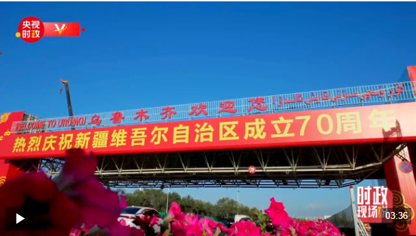 中共中央总书记、国家主席、中央军委主席习近平率中央代表团23日下午乘专机抵达乌鲁木齐,出席新疆维吾尔自治区成立70周年庆祝活动。14时20分许,习近平乘坐的专机在天山国际机场降落,等候在停机坪的新疆各族各界群众热烈欢呼。习近平走下舷梯时,少先队员献上鲜花。各族群众代表身着民族服饰,载歌载舞,欢迎总书记的到来,表达对总书记的衷心祝福。