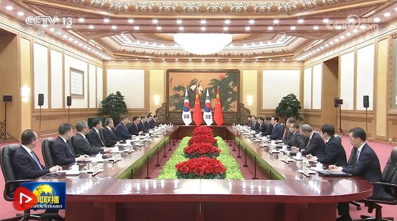 习近平指出,当前世界百年变局加速演进,国际形势更加变乱交织。中韩在维护地区和平、促进全球发展方面肩负重要责任,有广泛利益交集,应当坚定站在历史正确一边,作出正确战略选择。80多年前,中韩两国付出巨大民族牺牲,赢得抗击日本军国主义的胜利。今天更应携手捍卫二战胜利成果,守护东北亚和平稳定。作为经济全球化的受益者,中韩要共同反对保护主义,践行真正的多边主义,为推进平等有序的世界多极化、普惠包容的经济全球化作出贡献。