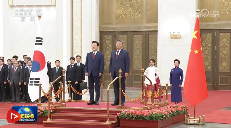 会谈前,习近平和夫人彭丽媛在人民大会堂北大厅为李在明和夫人金惠景举行欢迎仪式。