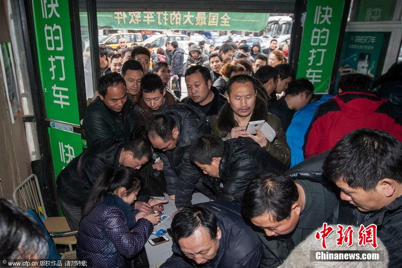 2014年2月19日,杭州“快的打车”服务点,出租车司机们排队安装软件。图片来源:CFP视觉中国