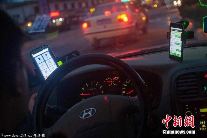 2014年2月19日,杭州,一位出租车司机同时开着两款打车软件。图片来源:CFP视觉中国
