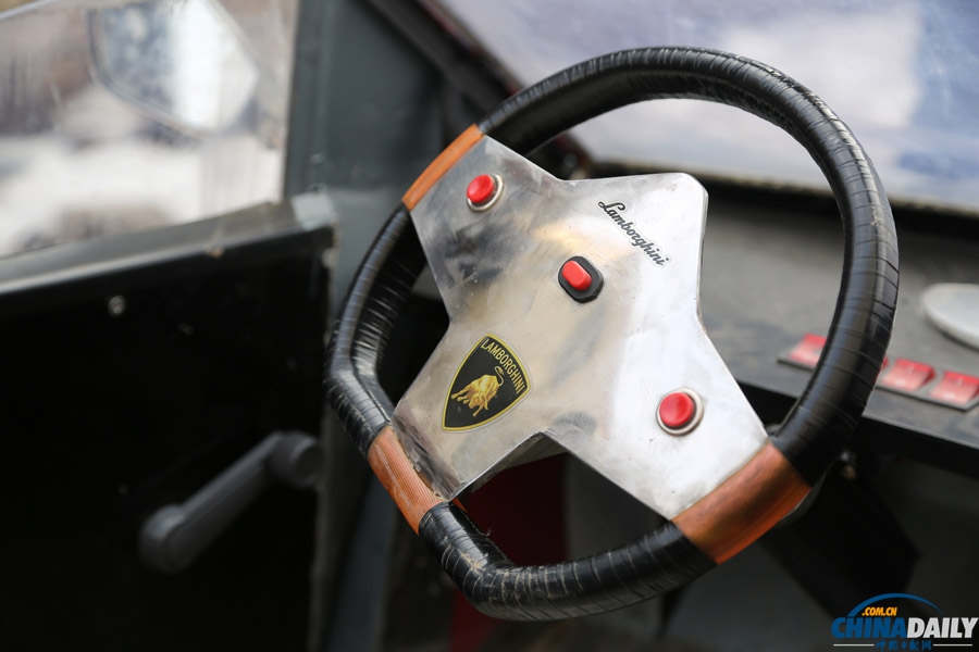方向盘中部按钮控制车子的前进、倒车。方向盘上的兰博基尼标志是老郭在网上购买的。(侯建勋 摄)