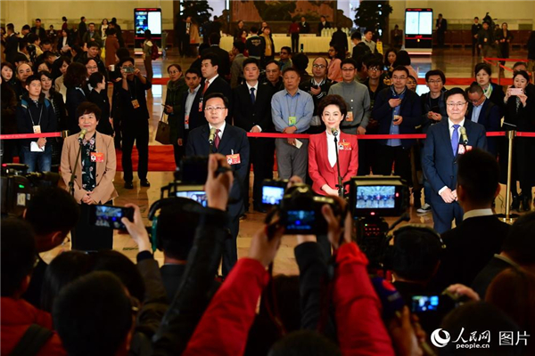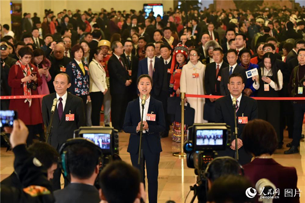 3月5日上午8:05,十三届全国人民代表大会第二次会议在人民大会堂举行首场“代表通道”。在首场“代表通道”中,8位全国人大代表接受了记者采访。(人民网记者 翁……