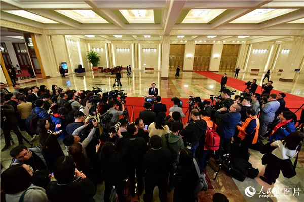 3月3日下午,全国政协十三届二次会议开幕会结束后,2019年全国两会“部长通道”在人民大会堂正式开启,部长们在这里直面热点,回应关切。人民网记者 于凯 摄……