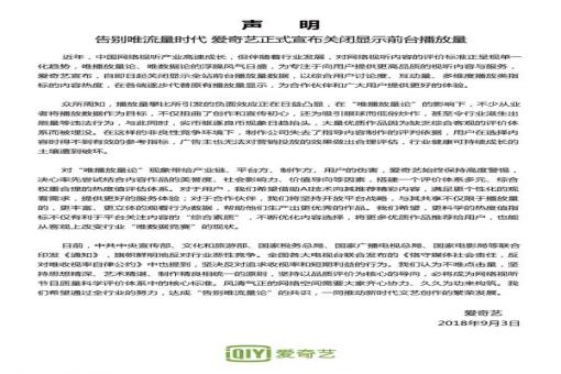 9月3日,爱奇艺发布声明,宣布正式关闭全站前台播放量显示,今后将逐步以内容热度代替原有播放量。内容热度包含用户观看行为数据、互动行为数据、分享行为等综合……
