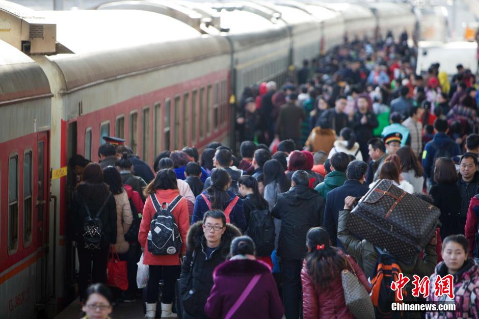 2月23日,山西太原火车站,民众正在排队等待乘车。随着农历春节“大年”结束,中国铁路迎来客流高峰。中国铁路总公司预计,当日中国铁路发送旅客925万人次。 张……