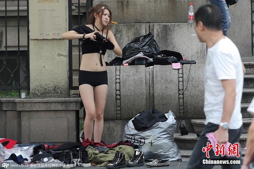 2015年9月4日,杭州中山中路一幢西式建筑外,几名模特在街头为网店拍摄秋冬服装新品,为节省换装时间,模特们淡定当街脱掉衣服,只剩内衣内裤,迅速换上另一套服……