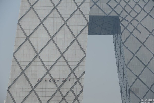 2015年4月9日消息,北京,近日有央视记者发微信说,央视新址大楼正在开始建成以来的首次外里面清洗,清洗费用50万元人民币,耗时需要40天。图为在央视大楼的外吊……