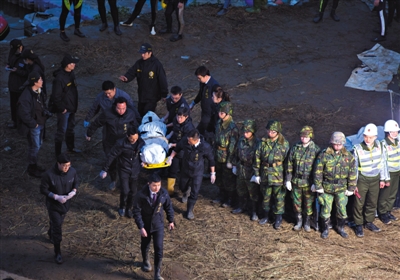 昨日,救援人员将搜寻到的乘客遗体搬上岸。当日,搜救人员在事故现场附近陆续寻获5名罹难者遗体。仍有3名旅客下落不明。新华社记者 金立旺 摄