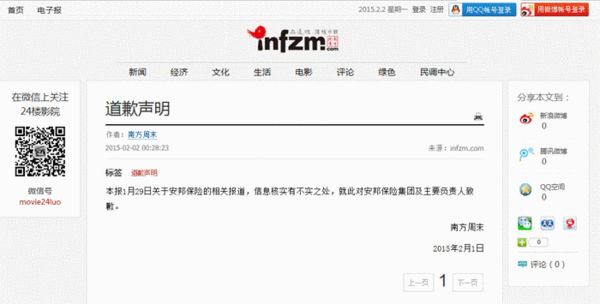 南方周末凌晨就安邦保险报道发道歉声明