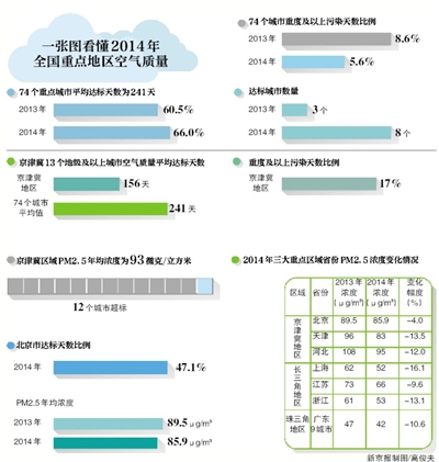 新京报讯 (记者金煜) 环保部昨日公布了去年重点区域和74个城市空气质量状况。去年全国PM2.5浓度有了普遍下降,京津冀区域PM2.5年均浓度降到93微克/立方米,虽然……