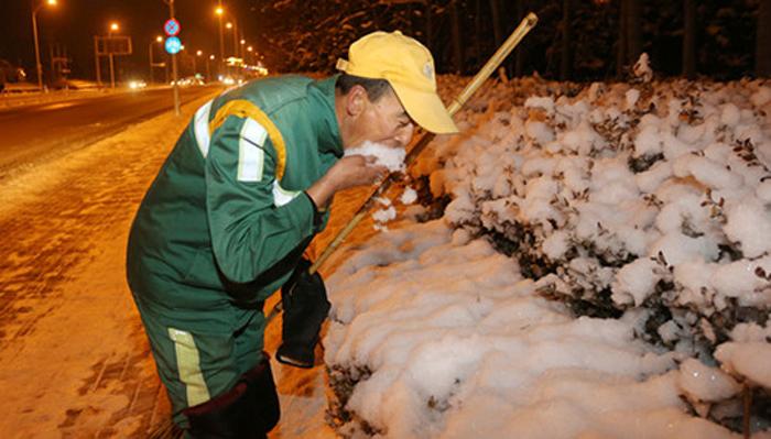 12月7日,辽宁大连,环卫工王喜义夫妇整整除雪17个小时。衣服被打湿,饭也来不及吃,只能抽空啃几口馒头;渴得实在受不了,他们会吃雪解渴。“我爱人拿扫帚扫道上……