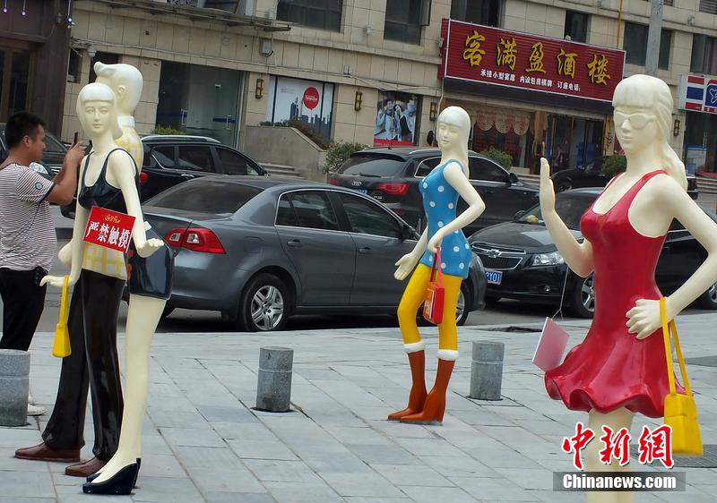 2014年8月6日,湖北宜昌市桔城路福久源商业街广场上塑起4个崭新的时尚模特塑像,其中3个“胸器”诱人的性感女模特塑像身上挂出了“严禁触摸”提示牌。……