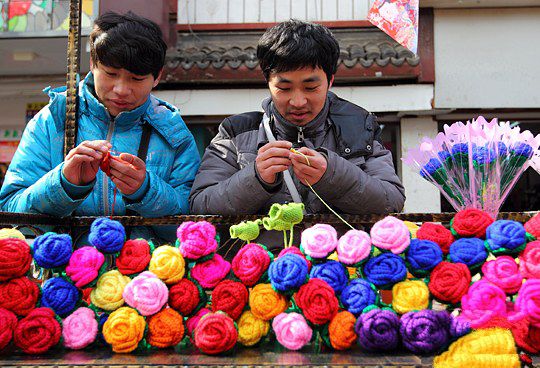 2月10日,南京夫子庙老街上的两位男青年用绒线和钩针编织手工玫瑰花引来围观。中新社发 泱波 摄据了解,这兄弟俩来自河南商丘,哥哥叫张冰、弟弟叫张赞,他俩在……